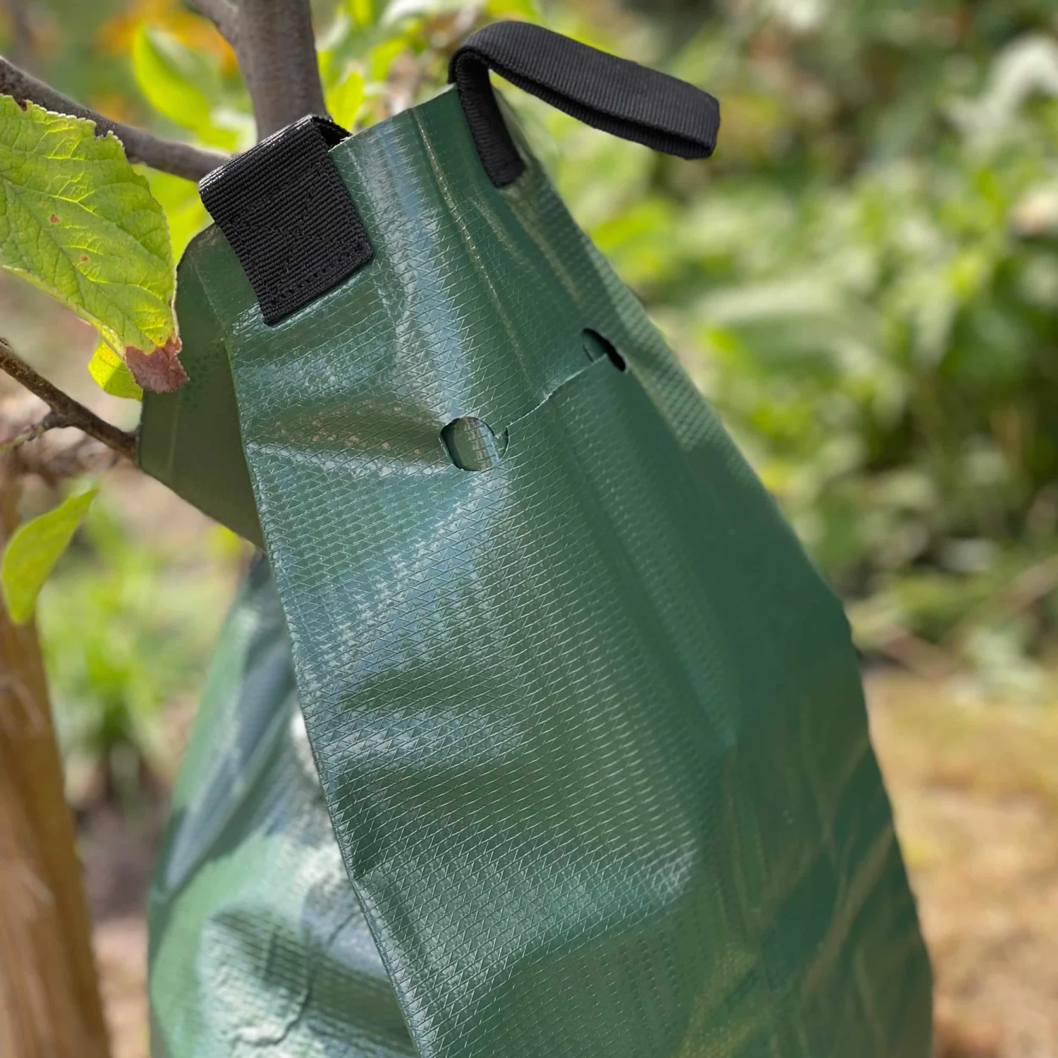 Hitze Hitze Hitze – Der Sommer macht uns manchmal ganz schön zu schaffen. Doch damit sind wir nicht allein. In lange Dürreperioden haben es besonders die Pflanzen schwer und sind darauf angewiesen, dass wir sie regelmäßig gießen. Bäume werden dabei leider häufig vergessen, obwohl ihnen die Trockenheit ebenso zu schaffen macht. Eine erste praktikable Lösung bietet dazu der Baum-Bewässerungsbeutel. Er wird mithilfe eines Reißverschlusses um den Baumstamm von 8 bis 13 cm Durchmesser geschnallt und verschlossen. Für größere Baumdurchmesser können mehrere Beutel an ihren Reißverschlüssen zusammengesetzt werden. Zum Befüllen mit dem Gartenschlauch wird der Reißverschluss ein wenig geöffnet. Durch die kleinen Löcher im Beutel wird das Wasser langsam und gleichmäßig an den Baum abgegeben, sodass es auch tiefere Erdschichten erreichen kann. So kommt das Wasser ohne nennenswerte Verluste genau dort an, wo es gebraucht wird. Drainage-Öffnungen sorgen zudem dafür, dass keine Staunässe entsteht. Je nach Witterungsbedingungen dauert die Wasserabgabe zwischen fünf und neun Stunden an. Der aus beschichtetem PVC (Polyester) gefertigte Beutel ist ebenso wetterfest wie UV-beständig und so für alle Abenteuer gewappnet. Er fasst etwa 75 Liter Wasser, die deinem Baum enorm weiterhelfen. Er wird es dir mit grüner Lebensfreude danken!