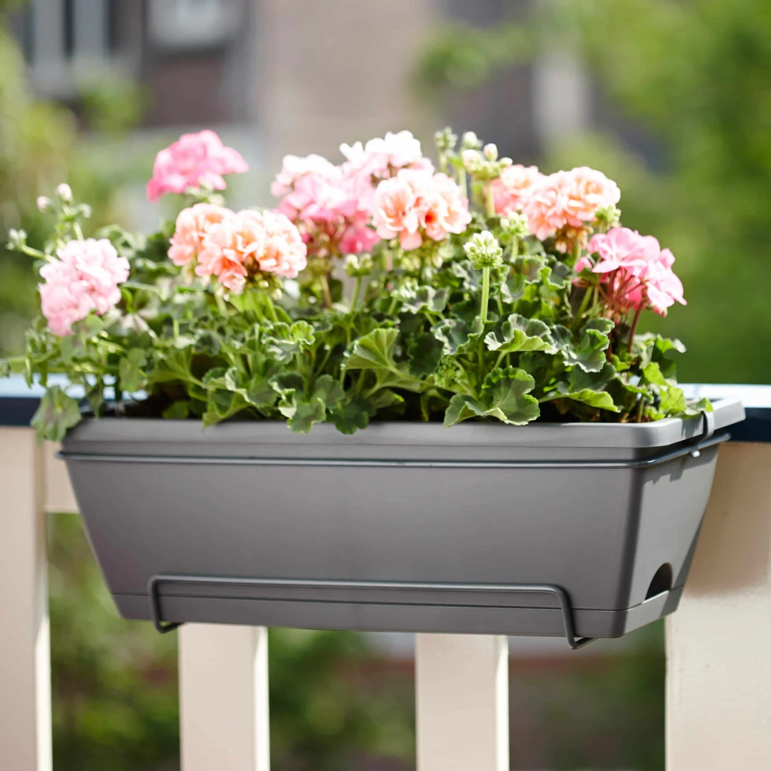 - komplettes Set aus Balkonkasten, integriertem Untersetzer und Halter