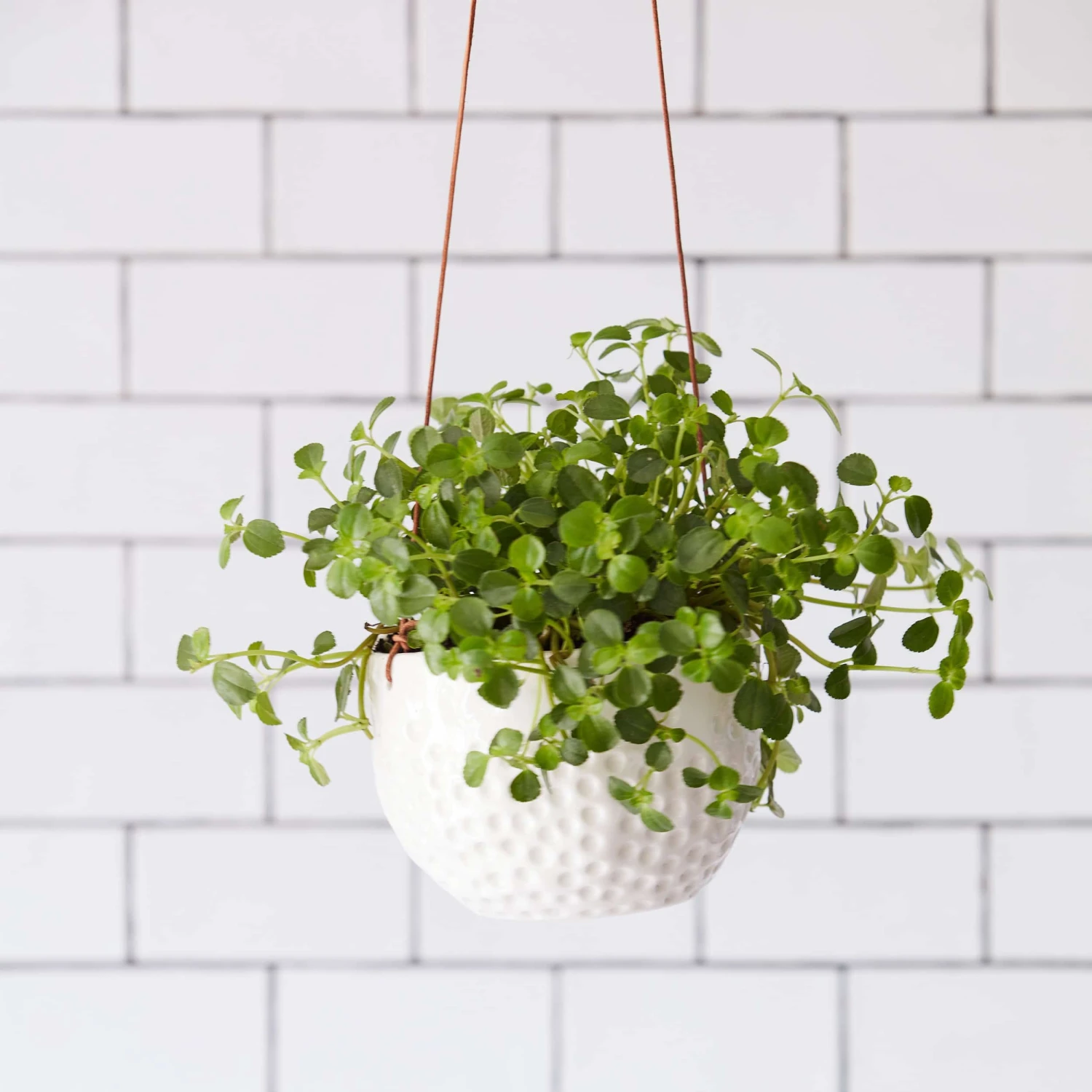 Der stylische Hängeblumentopf mit seinem wellenförmigen Rand und seiner Pünktchenstruktur ist ein besonderer Blickfang im Wohnraum oder im Fensterbereich.