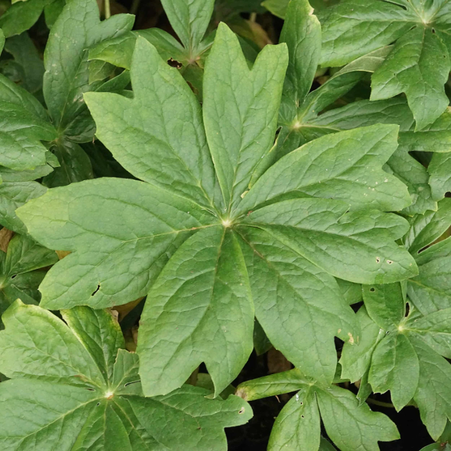 Der Maiapfel oder das Fußblatt (Podophyllum hexandrum) stammt ursprünglich aus den Himalaya-Gebieten in Nordindien und China. Seine hellrosa Blüten sind etwa fünf Zentimeter groß und schalenförmig. Sie können im Mai betrachtet werden. Optisch im Vordergrund stehen jedoch die handförmigen Blätter der Staude, die am Rand gelappt und teilweise tief eingeschnitten sind. Zunächst tief grün gefärbt, entwickeln sie nach der Blüte rotbraune Flecken, bevor sie zum Ende der Saison als Laub abgeworfen werden. Zudem bildet der Maiapfel nicht essbare, große rote Früchte aus, die im Kontrast zu den eindrücklichen grünen Blättern stehen. Das Fußblatt wächst aufrecht mit beblätterten Blütenstielen. Es wird bis zu 40 Zentimeter hoch und sollte mit einem Mindestabstand von 30 Zentimetern zwischen einzelnen Pflanzen ins Beet gesetzt werden.